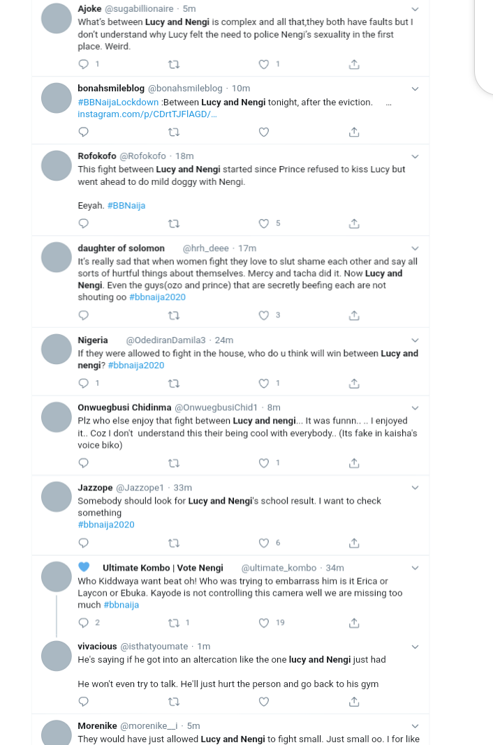 Lucy also blasted Nengi's IQ level saying even in school she focused on men and not her education. If you missed the video, watch it here.Nigerians as you would expect, have reacted to the drama.See some tweets