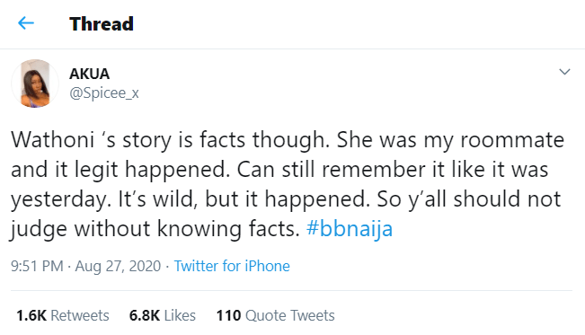 “Wathoni ‘s story is facts though. She was my roommate and it legit happened. Can still remember it like it was yesterday. It’s wild, but it happened.